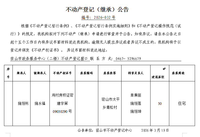 不动产登记(继承)公告编号:2026-施恒彬