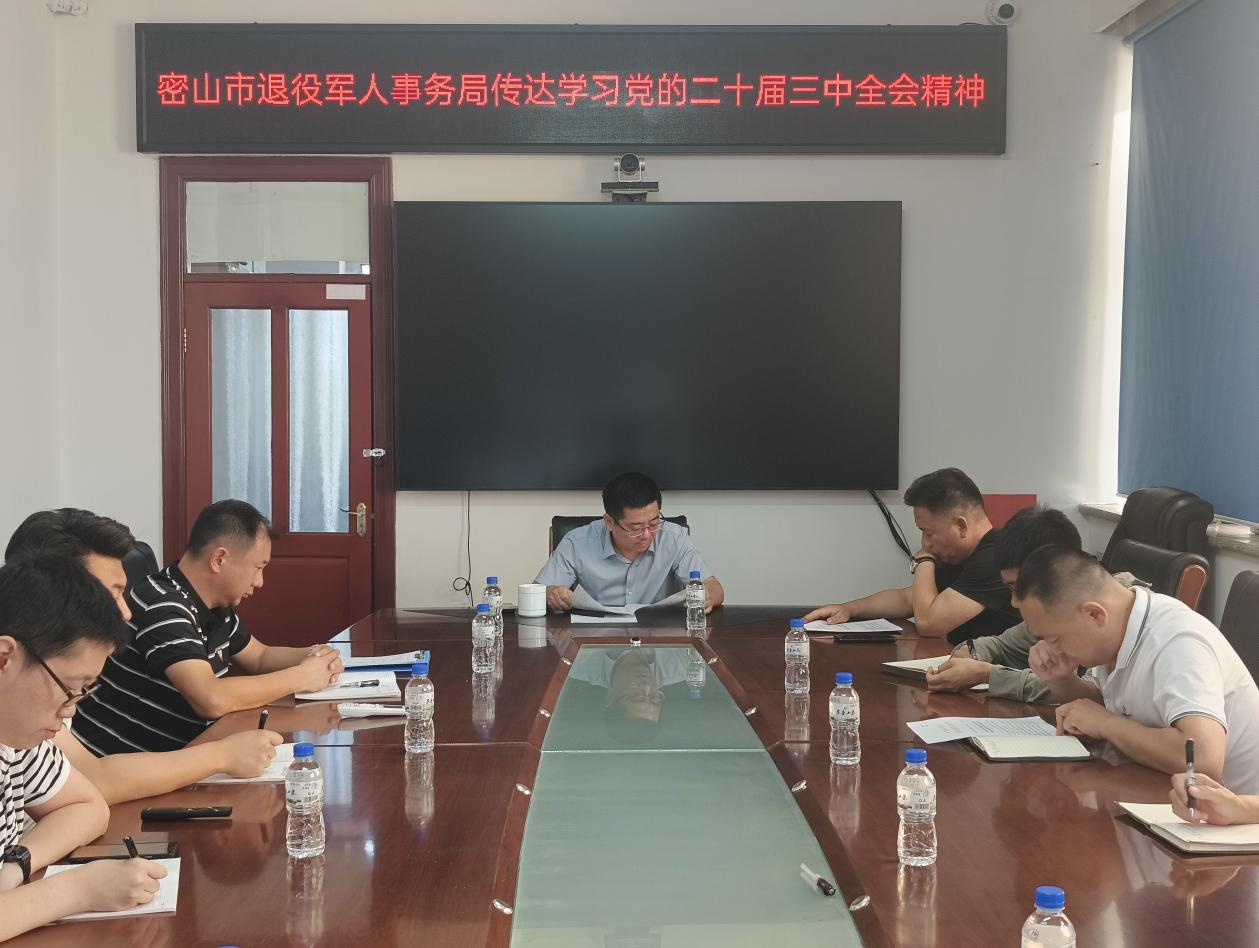密山市退役军人事务局召开专题会议,传达学习党的二十届三中全会精神,研究贯彻落实意见。会议由党支部书记、局长代强主持,局领导班子成员及各股室、局属各单位负责同志参加会议。